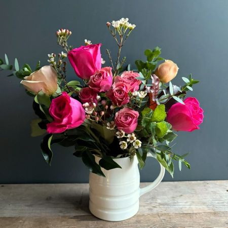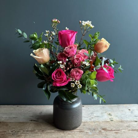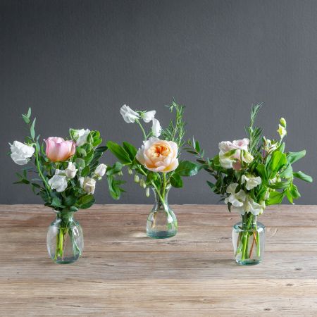 Shop our luxurious selection of flowers with vases. Our mini vases or glass flower tubes provide a unique way to showcase our gorgeous scented roses, flowers, herbs and foliage which are all grown on one of our sustainable farms. They make for a perfect gift for a loved one, a treat to yourself, or as a centrepiece for any event. Our florists hand tie a posy which is carefully packaged alongside the vase in one of our signature green boxes; ready for next day delivery.